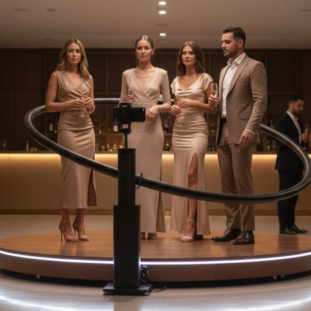 A modern, standing 360 booth that creates social-ready slow motion content guests love.