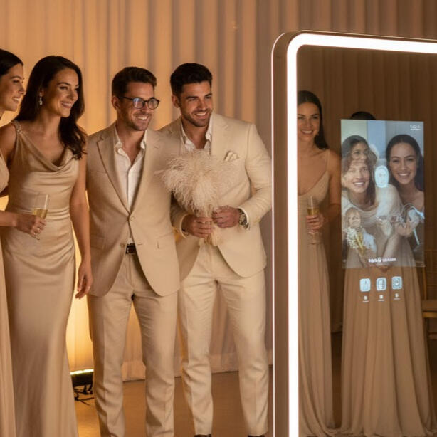 An interactive mirror booth with premium prints and digital keepsakes.